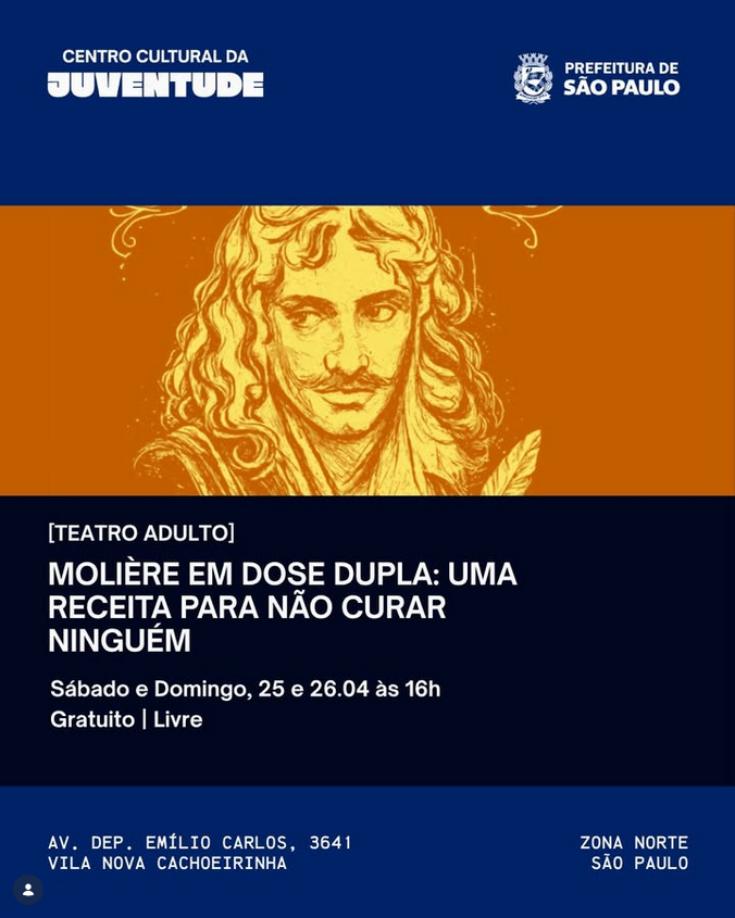 Anfiteatro Av. Dep. Emílio Carlos, 3641 - Vila Nova Cachoeirinha, São Paulo, SP, BrasilE se o próprio Molière conduzisse uma história onde tudo sai do controle? Nesse encontro entre “O Doente Imaginário” e “O Médico à Força”, acompanhamos uma sequência de situações absurdas, personagens exagerados e muita confusão! tudo através do jogo das