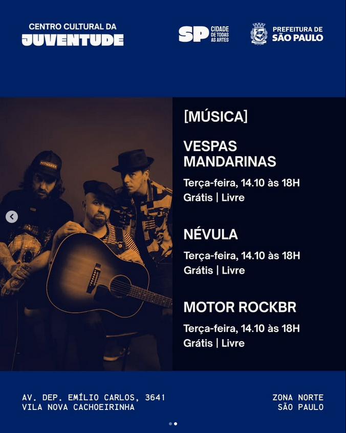 A noite começa com a Motor RockBR abrindo os trabalhos, depois é a vez da Névula mandar seu som autoral com muito peso e atitude. E pra fechar com chave de ouro, tem Vespas Mandarinas, uma das grandes referências do rock nacional, trazendo melodias marcantes e letras afiadas.